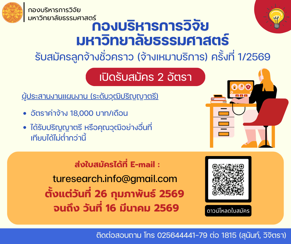 + ประกาศ!!! ฝ่ายวิจัยและนวัตกรรม มหาวิทยาลัยธรรมศาสตร์ เปิดรับสมัครลูกจ้างชั่วคราว (จ้างเหมาบริการ) ครั้งที่ 1/2569 ดูรายละเอียดเพิ่มเติม |