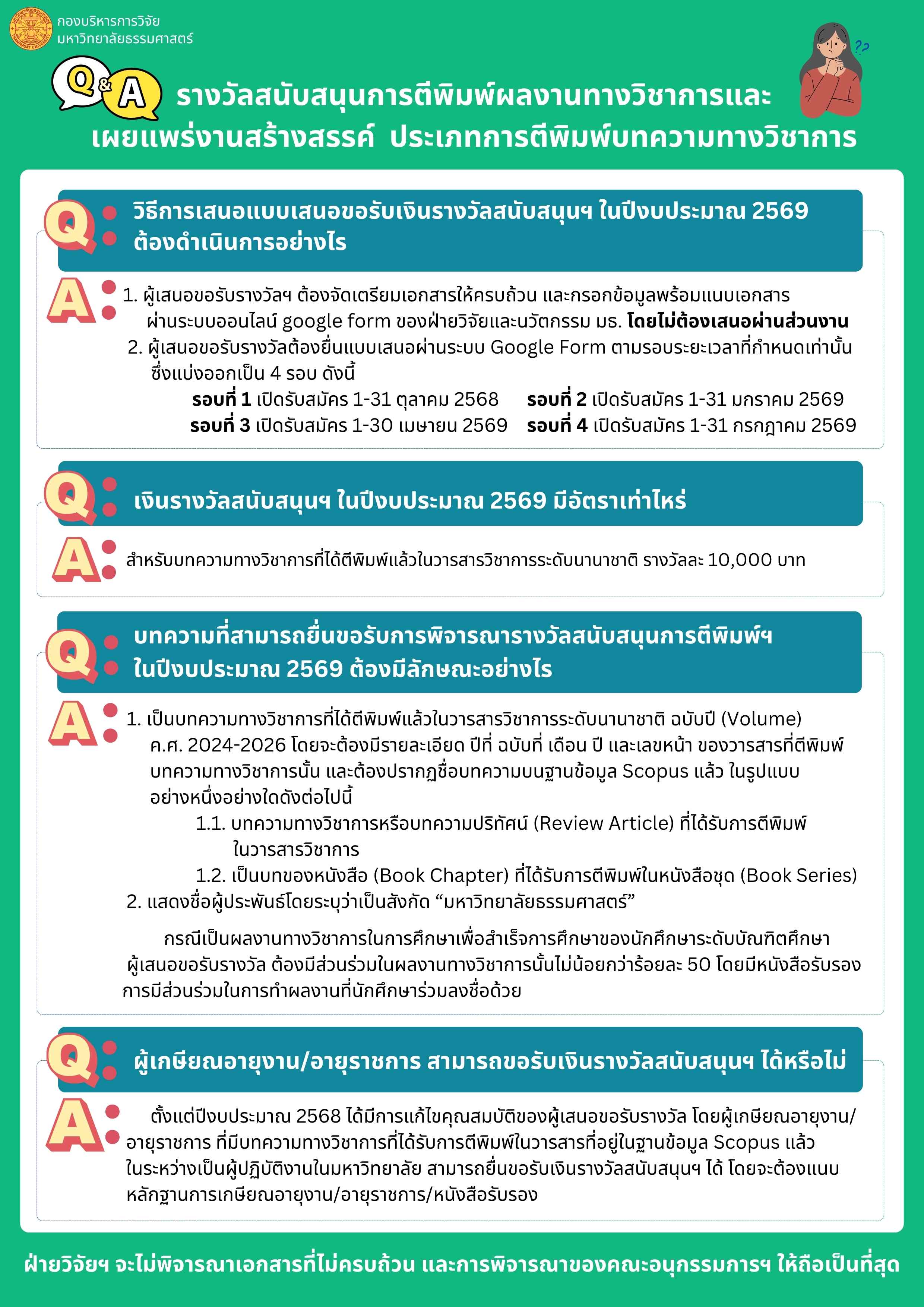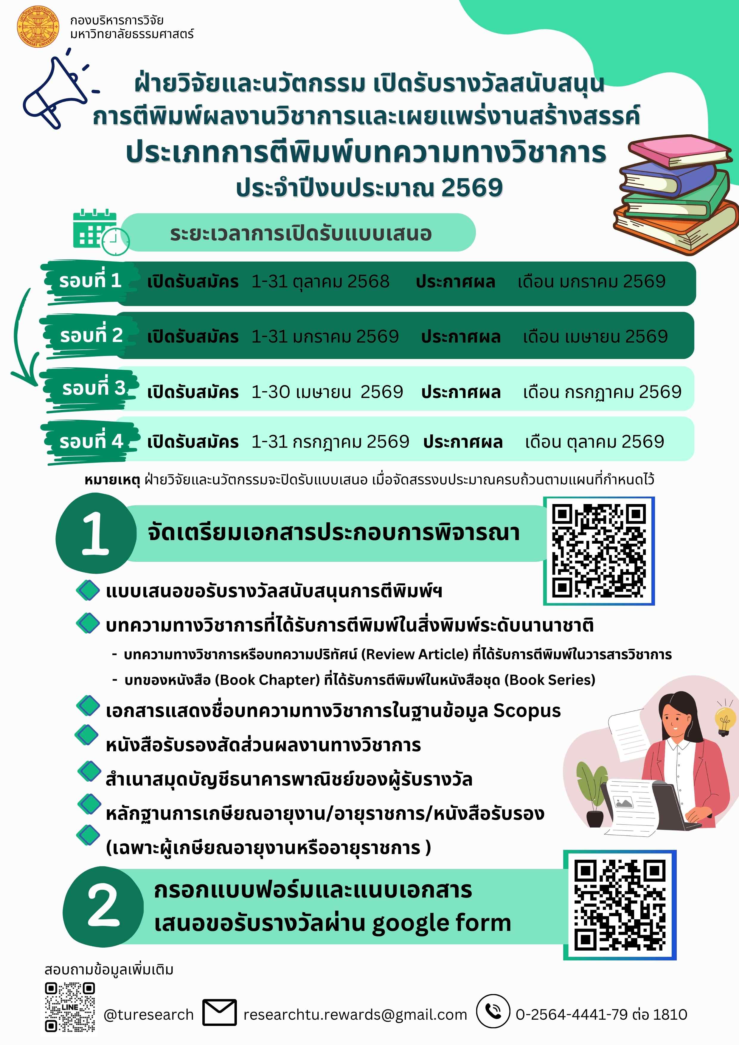 ประกาศมหาวิทยาลัยธรรมศาสตร์ เรื่อง รางวัลสนับสนุนการตีพิมพ์ผลงานทางวิชาการและเผยแพร่งานสร้างสรรค์ ประเภทการตีพิมพ์บทความทางวิชาการ พ.ศ. 2568