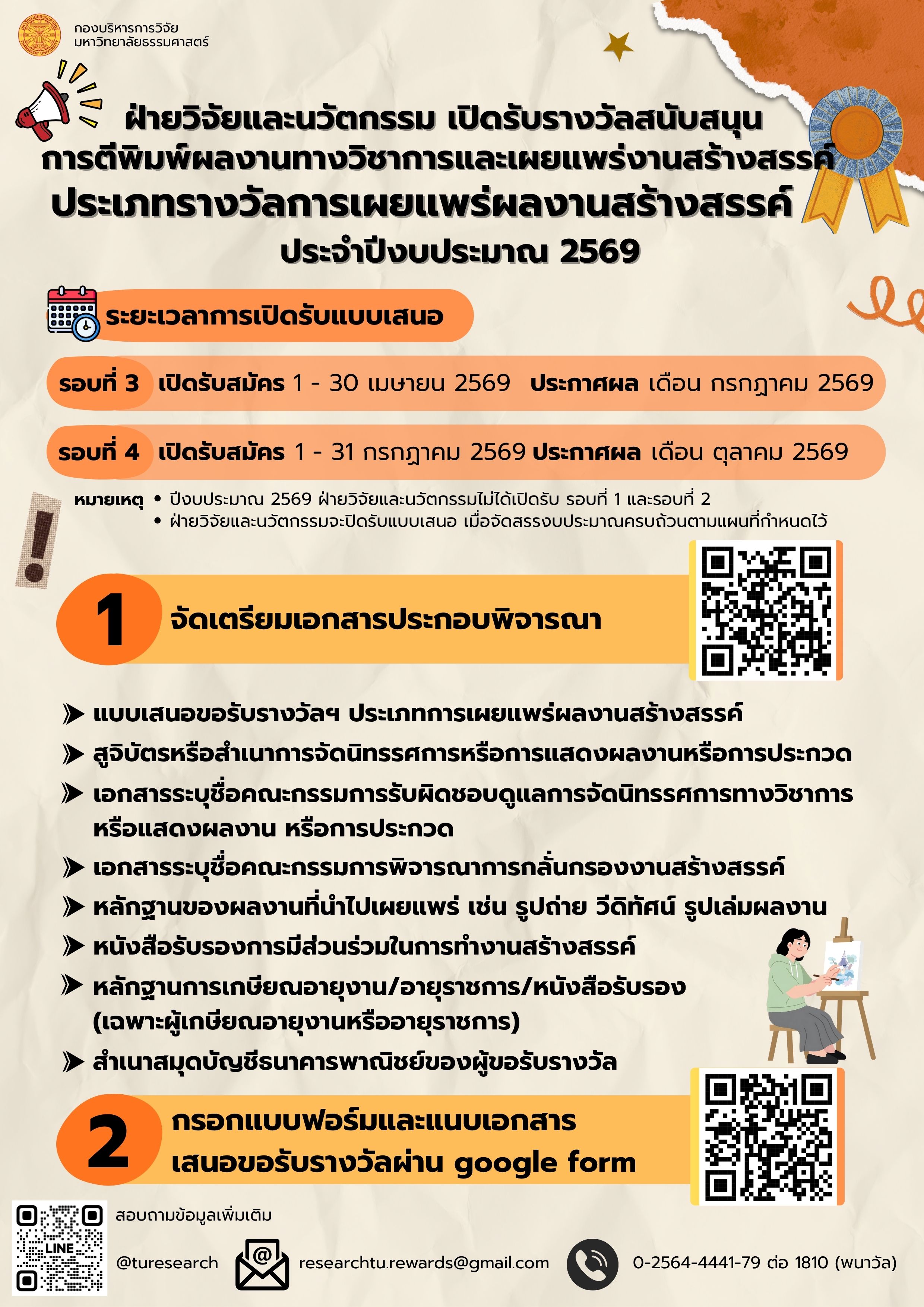 ติดต่อสอบถามข้อมูลเพิ่มเติม | นางสาวพนาวัล อิ่มอรชร (ส้มโอ) โทรศัพท์ (82) 1810 E-Mail : phanawan@tu.ac.th |