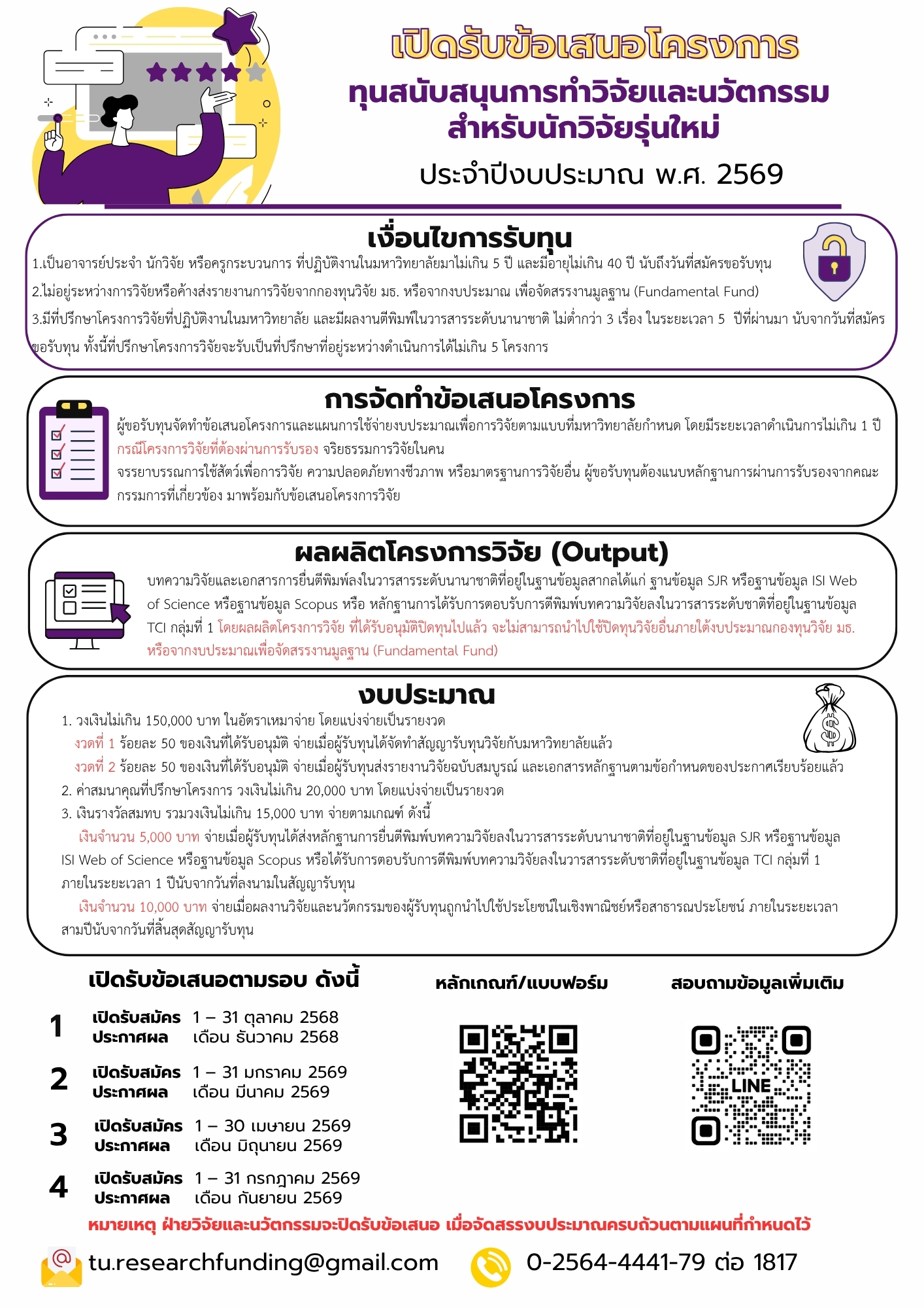 ประกาศมหาวิทยาลัยธรรมศาสตร์ เรื่อง ทุนสนับสนุนการวิจัย ประเภททุนสนับสนุนการทำวิจัยและนวัตกรรมสำหรับนักวิจัยรุ่นใหม่ พ.ศ. 2567